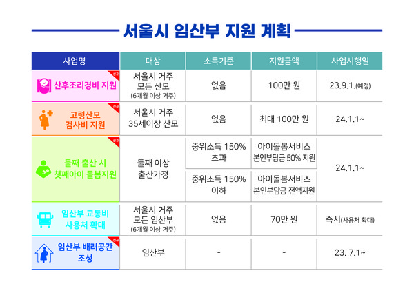 서울시는 이런 내용을 골자로 하는 임산부 지원대책을 본격적으로 추진, 소중한 생명탄생을 위한 임신과 출산을 응원하고 든든하게 지원하겠다고 밝혔다. 4년 간 총 2,137억 원을 투입한다.