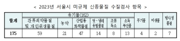 서울시는 법정 검사항목은 아니지만, 매년 시민의 관심이 높거나 관리가 필요한 물질을 ‘미규제 신종물질’로 선정, 선제적으로 검사를 강화해 나가고 있다. 올해도 잔류 의약물질 3항목, 산업용 화학물질 2항목을 포함 5항목을 추가해 원수와 정수에 대하여 총 175항목을 검사하고 있다.