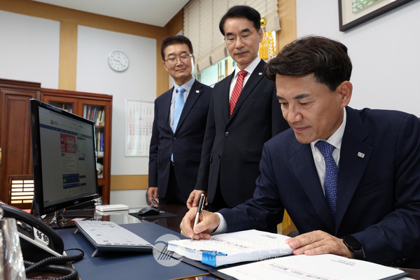 김진태 초대 강원특별자치도지사는 오늘 집무실에서 '강원특별자치도청 2811명 전 직원 임용서'를 1호 결재한 데 이어 미래산업 글로벌도시를 위한 '미래강원 2032 발전전략'에 2호 서명했다.