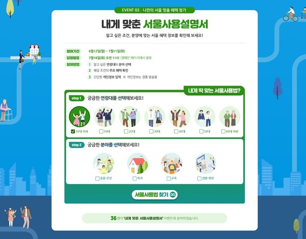 먼저, ‘생애주기로 알아보는 서울사용설명서’ 이벤트에서는 영유아, 아동‧청소년, 청년, 출산‧보육, 중장년, 어르신 등 생애주기별로 서울시가 추진하는 주요 정책을 단계별로 한 눈에 볼 수 있다.