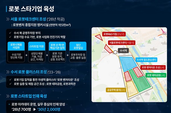 수서 일대는 로봇 기업이 집적하는 로봇 클러스터가 조성된다. 앵커시설로 서울 로봇테크센터를 구축하여 로봇 스타트업 사업화 전진기지로 삼고, 성장단계별 맞춤형 지원을 추진한다. 로봇 분야 산·학·연 핵심기관의 서울 분원을 유치하고, 로봇 테마공원과 로봇과학관도 조성하는 등 수서를 로봇 특화지역으로 육성한다. 연구기관과 협력해 ‘로봇 아카데미’를 운영하는 등 실무 중심의 로봇 인재를 2030년까지 1,500명 육성한다.