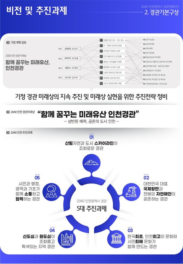 경관계획에는 ‘함께 꿈꾸는 미래 유산, 인천경관’을 미래상으로 ▲산림과 도시 스카이라인이 공존하는 경관 ▲대한민국 대표 국제 항만과 천혜의 자연 해안이 공존하는 경관 ▲한국 최초, 인천 최고의 문화와 시민 최애 문화가 함께 만드는 경관 ▲신도시와 원도심이 조화롭고 특색있는 지역 경관 ▲시민과 행정, 광역과 기초가 함께 소통하고 협력하는 경관을 만들어가기 위한 실천 전략이 담겨있다.
