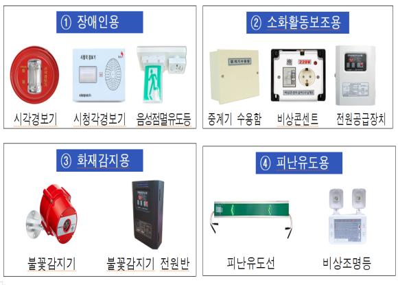 화재 발생 시 불빛 또는 음성으로 피난을 도와 안전하게 대피할 수 있도록 하는 시각경보기, 시청각경보기, 음성점멸유도등이 이에 해당된다