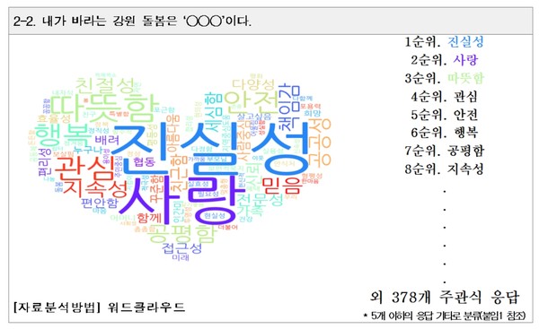 - ‘내가 바라는 강원돌봄은 ◯◯◯이다’ 주관식 응답, ‘진실성, 사랑, 따뜻함' 등 총 386개 키워드 도출