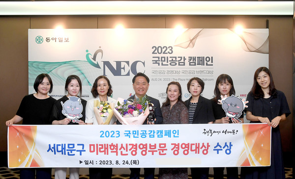 [한국지방정부신문=김지수 기자] 서울특별시 서대문구(구청장 이성헌)가 ‘행복 100% 서대문! 젊은경제·바른행정·신속성장 바로 서대문!’ 비전을 제시하며 형식과 격식을 타파한 생활밀착형 선도사업 등 지역 발전을 위한 혁신정책을 펼친 결과, 최근 더플라자호텔에서 열린 ‘2023 국민공감캠페인’에서 미래혁신경영 부문 경영대상을 거머쥐었다.