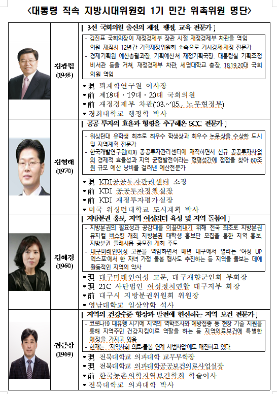 이날 위촉이 확정된 대통령 직속 지방시대위원회의 1기 민간위원에는 재정, 교육, 산업, 문화예술, 공공개혁, 규제정책, 지역의료 및 보건, 지방분권 등의 전문가를 중심으로 속도감 있는 지방분권 및 균형발전 실행을 위해 각계 저명한 인사들이 위촉됐다.