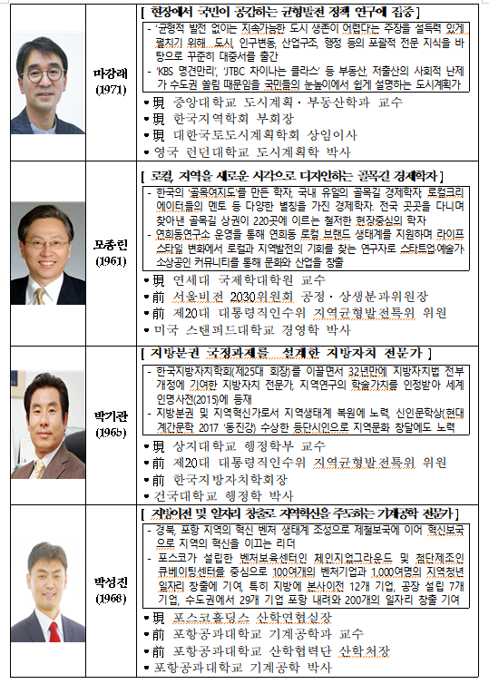 특히 지역에 거주하는 청년들의 현장 목소리를 정책에 적극 반영하기 위해 청년 활동에 앞장서는 지역인재가 다수 선정됐다. 청년의 다양한 요구를 수렴하기 위해 청년층 인재 발굴에 중점을 두었다. 박주희(45) 청년재단 사무총장과 추현호(38) 쿼타드림랩 대표는 지역 청년들과 실시간으로 소통하면서 청년들의 제안 및 애로사항을 정책에 반영하면서 청년들이 공감하는 젊은 지방시대 구현에 기여할 것으로 기대된다.