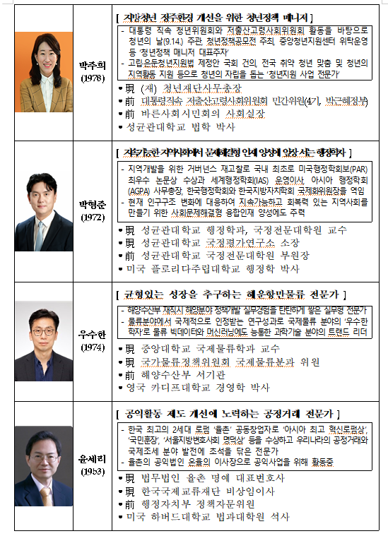 박형준 성균관대 교수는 지역개발을 위한 거버넌스 전문가로 규제 정책과 문제해결형 융합인재 양성에 적극 나서고 있다. 해수부 재직 경험을 갖고 있으면서 해운・항만 물류 전문가로 꼽히는 우수한 중앙대 교수, 교육부 차관을 지낸 이영 한양대 교수는 지역 인재와 산업정책 전문가로 꼽힌다.
