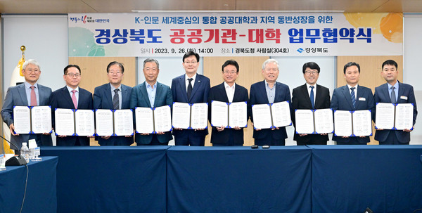 이와 관련 경북도는 26일 도청에서 안동대, 경북도립대, 경북연구원, 한국국학진흥원, 경북바이오산업연구원, 경북인재평생교육진흥원, 경북환경연수원, 경북인재개발원, 경북축산기술연구소와 ‘경상북도 교육‧연구 공공기관-대학 협력사업 공동 운영을 위한 업무협약’을 체결했다.