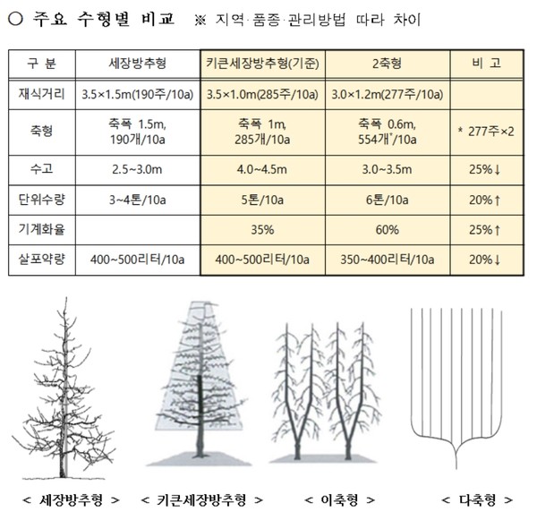 10a 당 심을 수 있는 사과나무 수는 △세장방추형 190주 △키큰세장방추형 285주 △2축형(다축형) 277주 등이다.