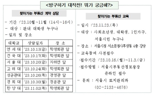 시는 13일부터 변호사, 공인중개사 등 전문가와 함께 주로 대학 현장을 찾아 맞춤형 부동산 상담 및 교육을 실시 중이다. 교육의 경우, 온라인 사전 신청이 필요하다.