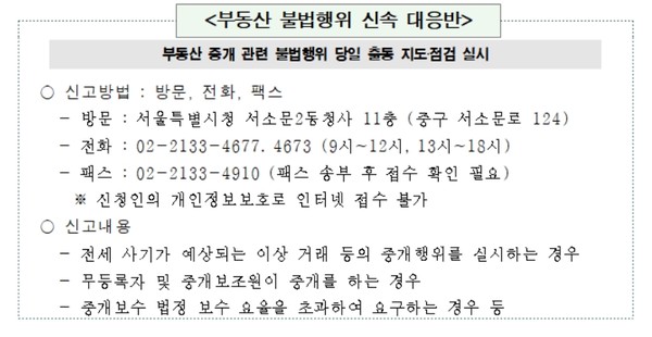 마지막으로 서울시는 신속한 부동산 불법행위 지도·점검을 통해 위법행위 확산을 방지하기 위해 ‘부동산 불법행위 신속대응반’을 운영 중이다. 시는 위반업소를 발견하거나 피해가 예상되는 경우 시민들의 적극적인 신고‧제보를 당부했다.