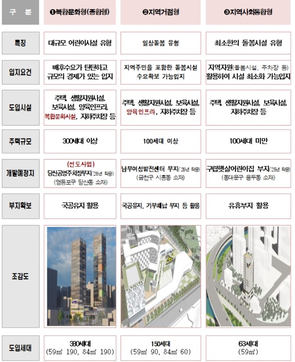 양육친화주택 아이사랑홈은 주택규모와 입지요건 등에 따라 ①복합문화형 ②지역거점형 ③지역사회통합형, 세 가지 유형으로 추진된다. 준비절차를 거쳐 이르면 2025년 착공해 2027년부터 차례로 선보일 계획으로, 서울주택도시공사(SH)가 건립해 공급한다.