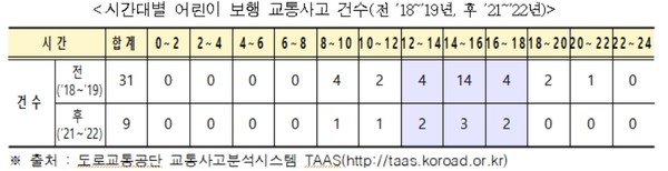 하교 시간대(12~18시) 교통사고 건수는 무인단속카메라 설치 전 22건, 설치 후 7건이다.