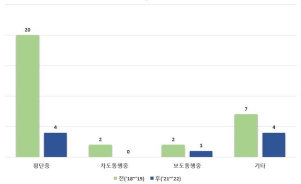 - ‘횡단 중’ 사고 20건(64.5%) 가장 많이 발생...무인단속카메라 설치 후 4건으로 크게 감소