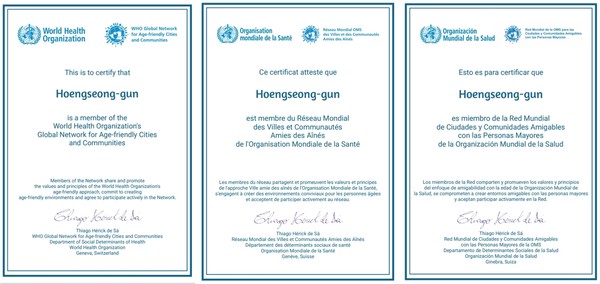 이와 관련 횡성군은 초고령 사회의 문제를 인식하고 다각적으로 해결책을 마련하고 있는 지방정부로 인정받아 세계보건기구로부터 고령친화도시 국제네트워크 가입을 승인받았다고 1일 밝혔다.