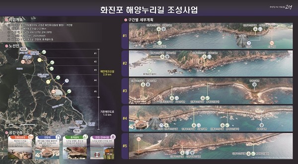 화진포 김일성 별장에서부터 거진항 구간에 조성되는 이번 공사는 천혜의 아름다운 해안 절경을 보유하고 있음에도 군사시설보호구역으로 설정되어 그동안 민간인 출입이 엄격히 통제되었던 비공개 지역으로, 군부대의 적극적인 협조와 고성군의 부단한 노력으로 지난해 하반기 모든 인허가 절차를 마치고 현재 공사발주 전 최종 단계인 계약심사 절차를 진행 중이다.