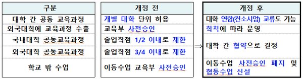 아울러 외국대학과의 공동교육과정(졸업학점의 3/4 → 대학 간 협약 범위) 및 국내대학 간 공동교육과정의 학점 인정 범위를 확대(졸업학점의 1/2 → 대학 간 협약 범위)하여, 대학의 교육과정 운영 및 학생의 교육과정 설계에 자율성을 확대했다.
