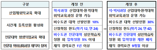 이번 시행령 개정의 중점 방향은 ▲대학 내 벽 허물기 촉진 ▲국내・외 대학 및 산업체・연구기관과의 교류・협력 강화 ▲재직자와 지역주민의 고등교육 참여 기회 확대 ▲학생의 권익보호와 대학 행정부담 완화 등 네 가지다.