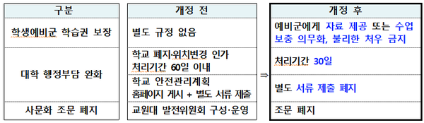 학생 예비군에 대한 학습권 보장 조항을 신설한다. 이를 통해 대학이 학생 예비군에게 수업과 관련한 자료를 제공하거나 수업 보충을 실시하도록 하고, 출결 및 성적 처리 등에 있어 불리한 처우를 하지 않도록 하는 등 학습권 보장 조치 의무를 명시하도록 했다.