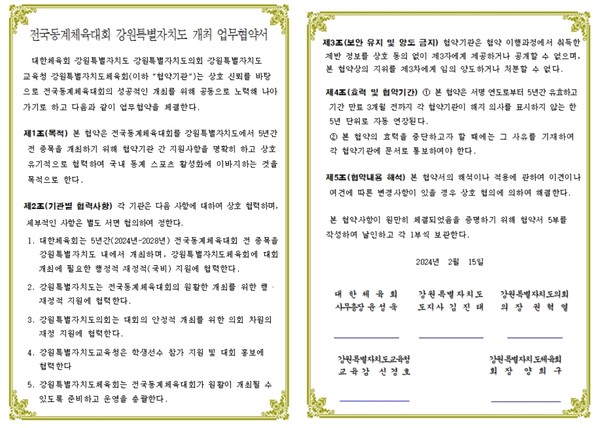 협약서의 핵심내용은 5년간 전국동계체육대회 전 종목을 도내에서 개최하며 행·재정적 지원 협력을 주요 골자로 하며, 도교육청은 학생선수 참가지원과 대회홍보에 협력하게 된다.