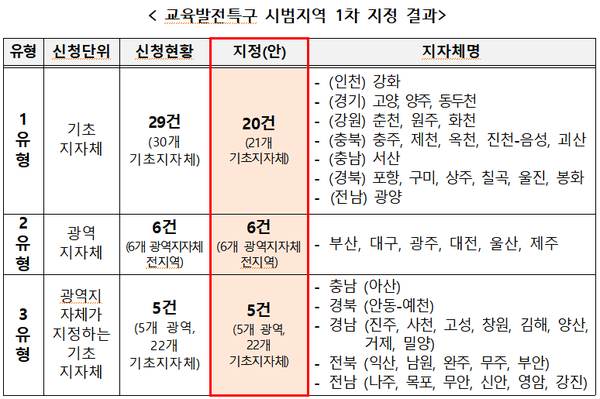 교육발전특구 시범지역 1차 지정은 교육발전특구위원회가 지정의 합목적성, 사업계획의 우수성, 연계·협력의 적절성, 재정 계획의 적정성, 성과관리의 체계성 등을 중점적으로 평가했고, 평가 결과에 이의가 있는 경우 3월 8일까지 교육부에 이의신청을 할 수 있다.