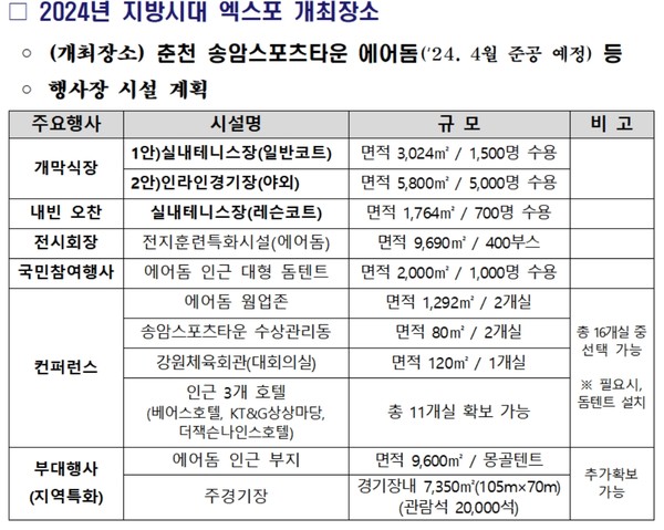 - 춘천 송암스포츠타운 내 설치되는 전지훈련 특화시설 '에어돔'을 주행사장으로 선정...춘천시와 함께 지난 1월부터 엑스포 유치 추진단 구성, 유치 활동 펼쳐