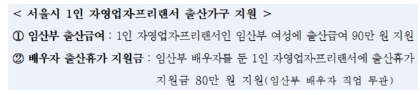 출산한 여성 자영업자와 프리랜서는 기존 고용보험 지원(150만 원)에 서울시가 추가로 90만 원을 지원해 총 240만 원(90일)을 보장받는다. 또한, 그동안 지원이 전무했던 출산 배우자를 둔 남성 1인 자영업자와 프리랜서도 ‘배우자 출산휴가 지원금’ 80만 원을 받게 된다.