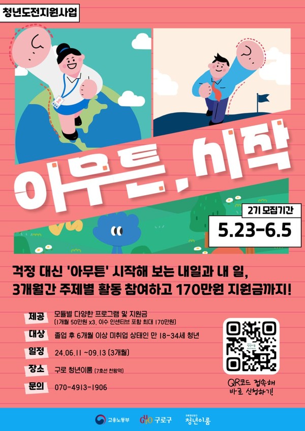 신청은 5월 23일부터 6월 5일까지 워크넷 누리집에서 할 수 있다. 선착순 20명을 모집하며 최근 6개월간 취업ㆍ교육ㆍ직업훈련 참여 이력이 있는 청년은 참여가 제한된다. 자세한 사항은 청년이룸이나 구로구청 일자리지원과로 문의하면 된다.
