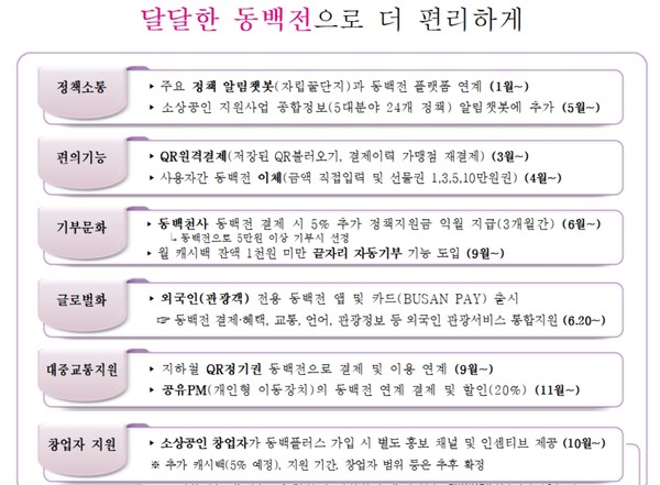 동백전과 연계한 대중교통 활성화 시책도 추진한다. 부산도시철도 앱을 설치하고 역사 내에서 충전해야 하는 도시철도 모바일 큐알(QR) 정기승차권(1일권, 3일권)을 오는 9월부터 동백전 앱을 통해 구입·사용할 수 있도록 한다.