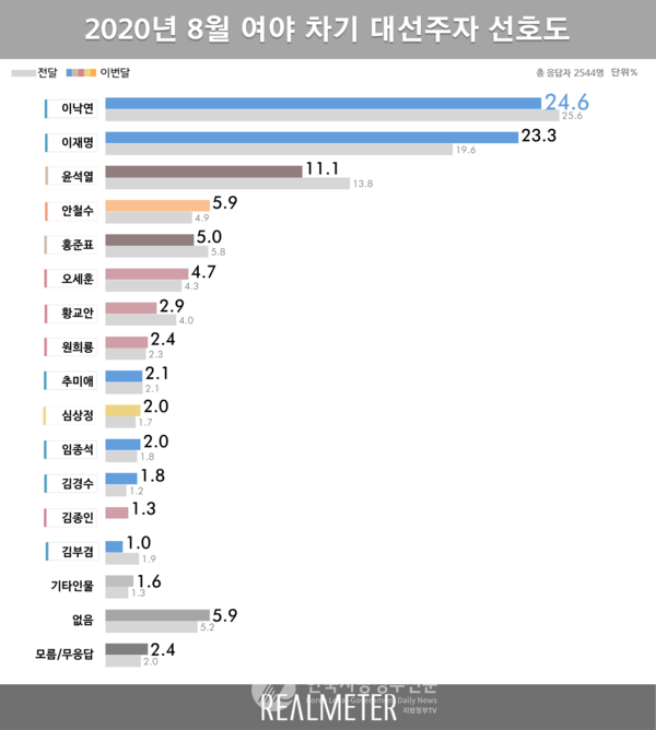 ‘오마이뉴스-리얼미터 2020년 8월 차기 대선주자 선호도 조사’, 1위 이낙연 24.6%(1.0%p↓), 2위 이재명 23.3%(3.7%p↑), 3위 윤석열 11.1%(2.7%p↓), 4위 안철수 5.9%(1.0%p↑)