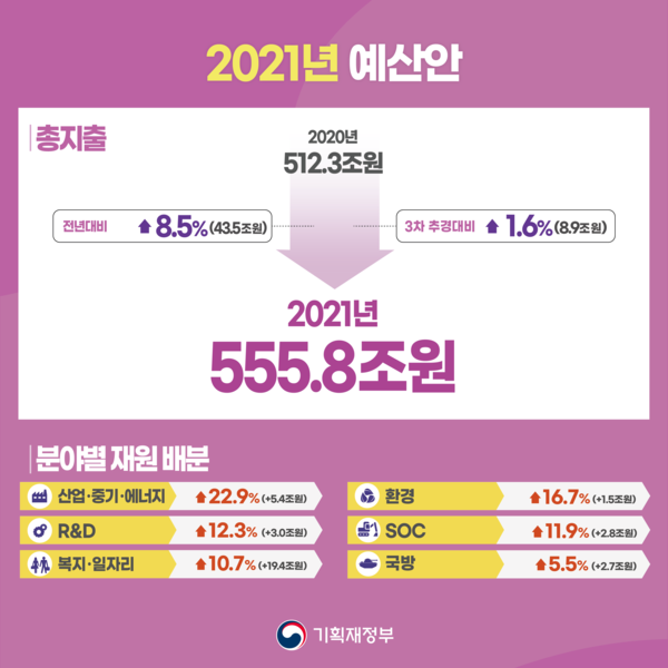 [한국지방정부신문=정양기 기자] 내년 예산안이 올해보다 8.5% 늘어난 555조8천억 원으로 편성됐다. 내년 총수입은 483조원으로 총지출보다 72조8천억 원 부족할 것으로 예상되는 적자재정이다.