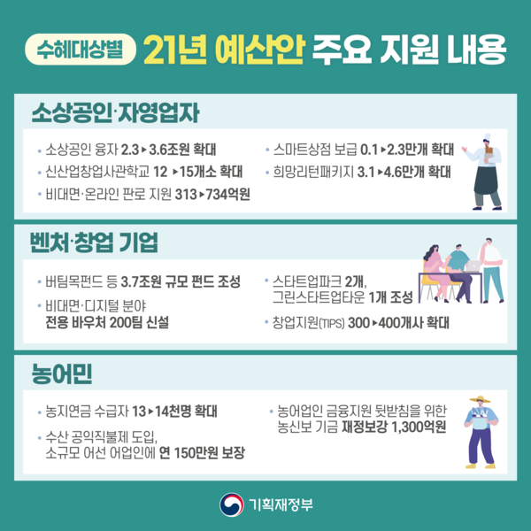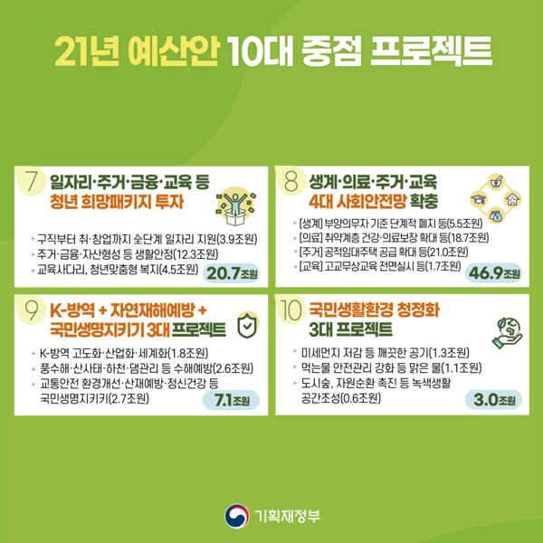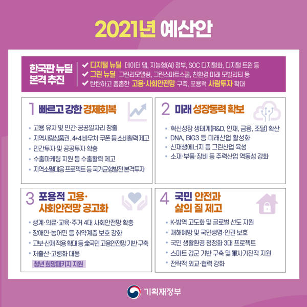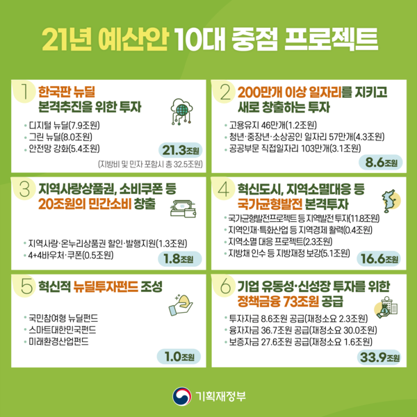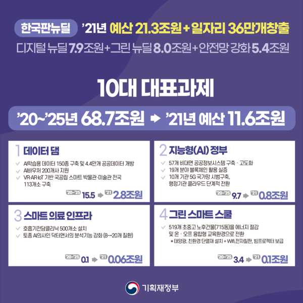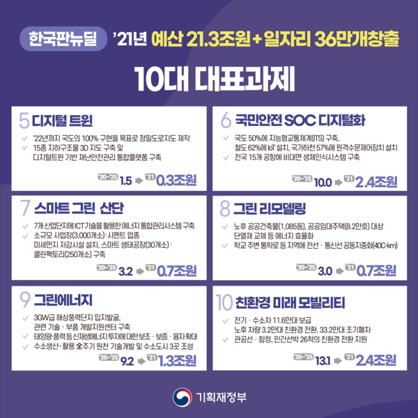미래성장동력을 확보하기 위한 한국판 뉴딜사업엔 21조3천억 원을 투입한다. 데이터댐 구축과 5G, AI기반 지능형 정부 사업 등을 하는 그린뉴딜엔 8조원, 그린모빌리티 보급 확대 등 그린뉴딜엔 8조원이 들어간다.