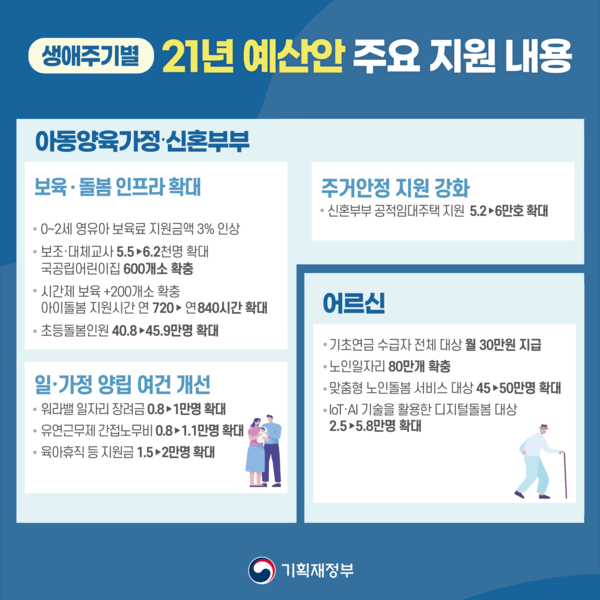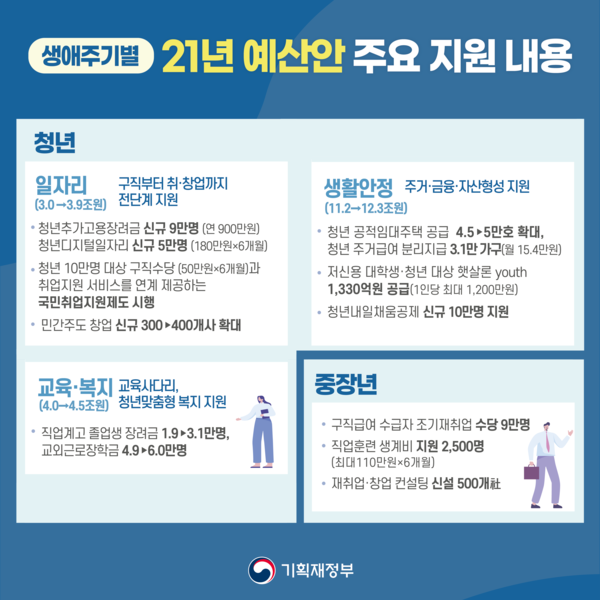 사업별로는 일자리 예산이 30조6천억 원으로 올해보다 20% 늘었다. 청년일자리에는 9천억 원 늘어난 3조9천억 원, 노인일자리에는 1천억 원 증가한 1조3천억 원이 배정됐다.