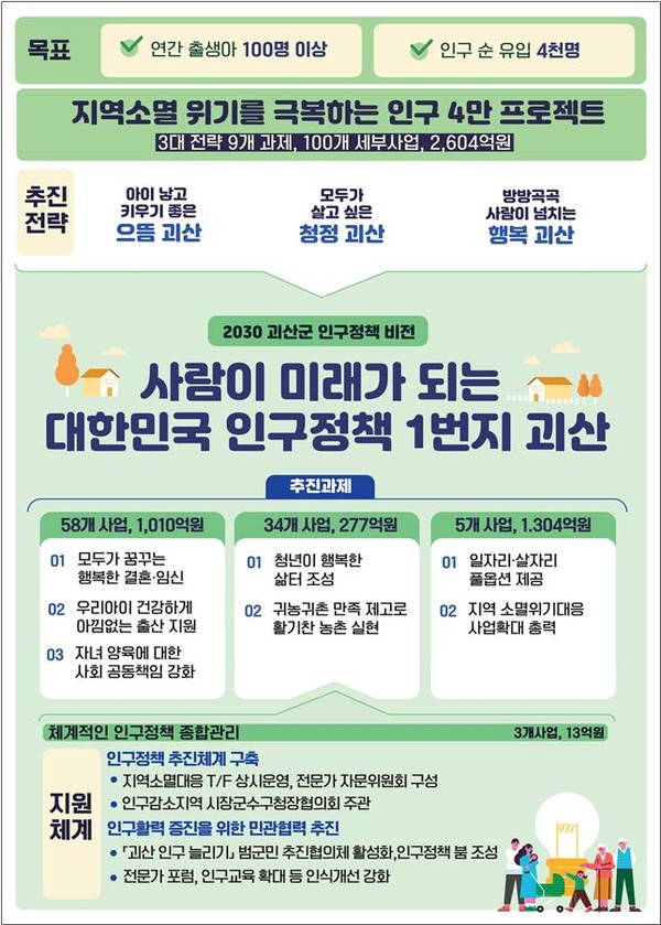 군이 발표한 이번 추진전략은 ‘사람이 미래가 되는 대한민국 인구정책 1번지 괴산’이라는 비전 아래, 오는 2030년까지 ▲연간 출생아수 100명 이상 회복 ▲인구 순유입 4천 명 달성 목표를 설정했다.