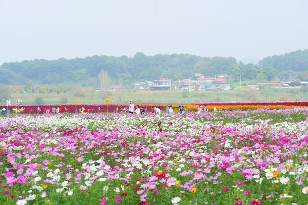 이와 관련 부여군이 백마강 구드래에 조성한 대규모 코스모스 단지가 절정을 맞아 관광객들의 발길을 사로잡고 있다.