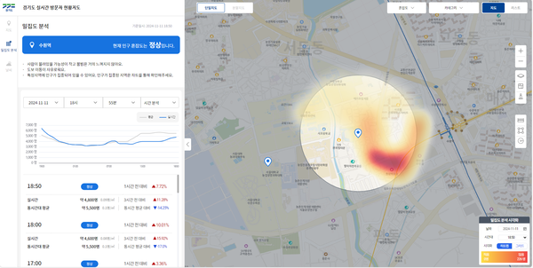 ‘방문자 현황지도’는 경기도 사회재난 부서에서 활용하는 인파 관리 시스템의 하나로, 수원역과 에버랜드 등 도내 주요 148개 지점의 실시간 방문객 수와 시간대별 방문 현황 등을 5분 단위로 업데이트해 나타낸다.