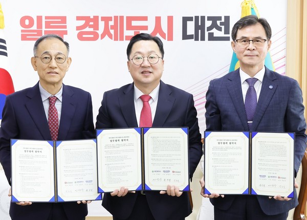 이날 협약은 대전 꿈씨 캐릭터 굿즈 활성화 사업의 일환으로 ‘대전의 정체성을 담은 라면제품 상품화’를 위해 이장우 대전시장과 윤성국 대전관광공사 사장, 박균익 ㈜아이씨푸드 대표가 참석했다.