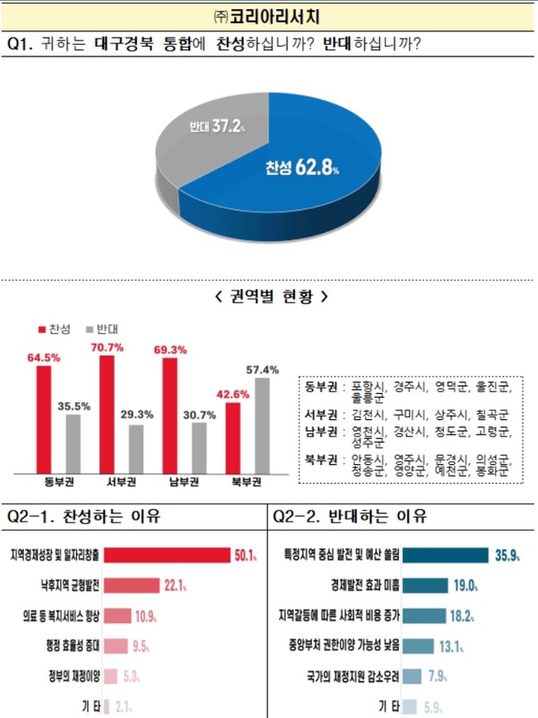 객관적이고 정밀한 여론조사를 위해 같은 기간 동안 동일한 문항으로 ㈜한국리서치에도 대구시민 1천 명을 대상으로 여론조사를 의뢰한 결과, 대구시민의 62.8%가 통합에 찬성하는 것으로 조사됐고, 찬성하는 이유 역시 △지역 경제성장 및 일자리 창출(60.6%), △낙후지역 균형발전(17.2%), △행정효율성 증대(9.1%) 순으로 ㈜코리아리서치와 유사한 결과로 조사됐다.
