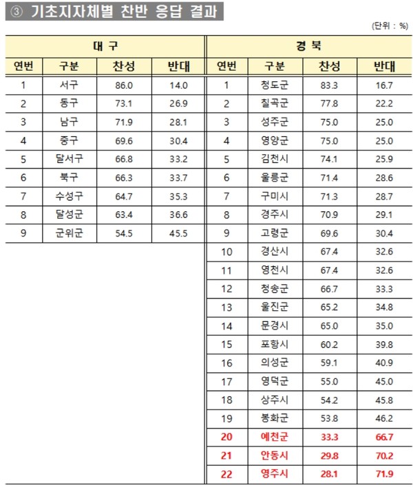 대구시 구·군별 결과를 보면 9개 구·군 모두 찬성의견이 반대의견보다 높았으며, 서구(86.0%), 동구(73.1%), 남구(71.9%)는 70% 이상의 높은 찬성률을 보였다.