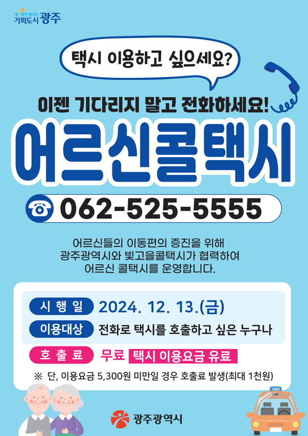 [한국지방정부신문=조용원 기자] “어르신 전화 한통으로 편하게 택시 이용하세요” 광주광역시(시장 강기정)가 디지털 문화가 익숙하지 않은 고령자 이동권 보장을 위해 광역지방정부 최초로 ‘어르신 전용 콜택시’를 도입·운영한다.