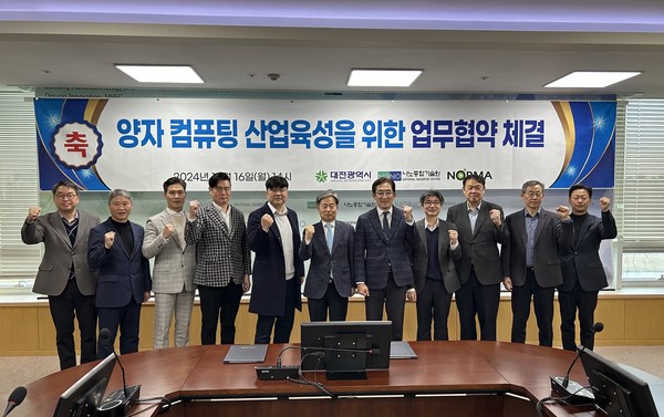 대전시는 올들어 개방형 양자팹, 양자컴퓨팅 양자전환 스케일업 밸리 육성사업 등 양자컴퓨팅 관련 주요 정부사업 유치를 통해 양자산업 허브로서의 입지 강화에 힘쓰는 데 이어, 16일 양자컴퓨팅 전문 기업 노르마, 나노종합기술원과 양자컴퓨팅 기술 개발 및 상용화 협력을 위한 업무협약을 체결했다.