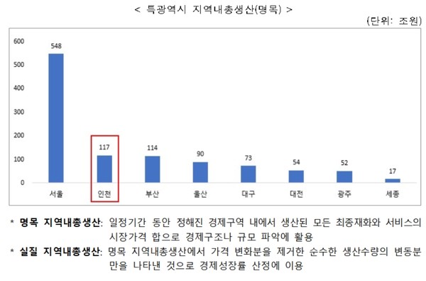 지난 9월 통계청이 발표한 ‘지역소득 2020년 기준년 개편 결과’에서 2021년 인천의 지역내총생산(GRDP)이 104조 원을 기록하여, 사상 처음으로 100조 원을 돌파한 이후로 2022년 113조, 2023년 117조(잠정)를 기록하여 특광역시 중 서울에 이어 경제규모 2위를 굳건히 지키고 있다.