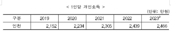 2023년 인천의 지역총소득(GRI)은 124조 원(전국의 5.1%)으로 전년 대비 4.8% 증가했으며, 1인당 개인소득 또한 매년 꾸준히 증가하여 2,466만 원을 기록했다.