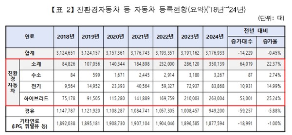- ‘친환경 자동차’는 하이브리드차량(25.24%), 전기차량(14.99%), 수소차량(2.74%)...전년 대비 6만4,019대 증가