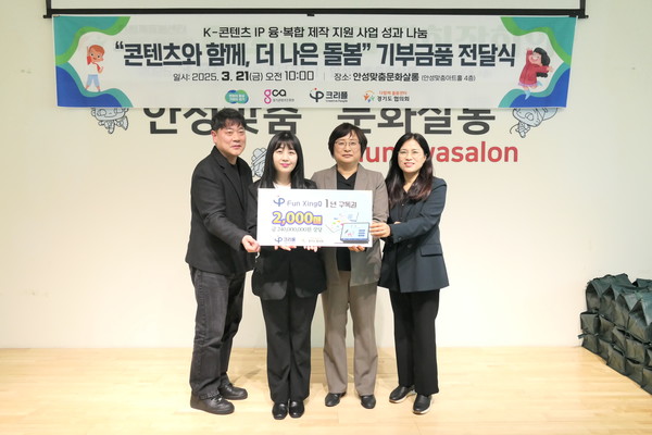경기도의 ‘K-콘텐츠 IP(지식재산권) 융복합 제작 지원’ 사업으로 성장한 콘텐츠 업체인 ‘㈜크리플(대표 임은채)’이 2억 4천만 원 상당의 콘텐츠 구독권을 다함께돌봄센터 경기도협의체에 기부했다.