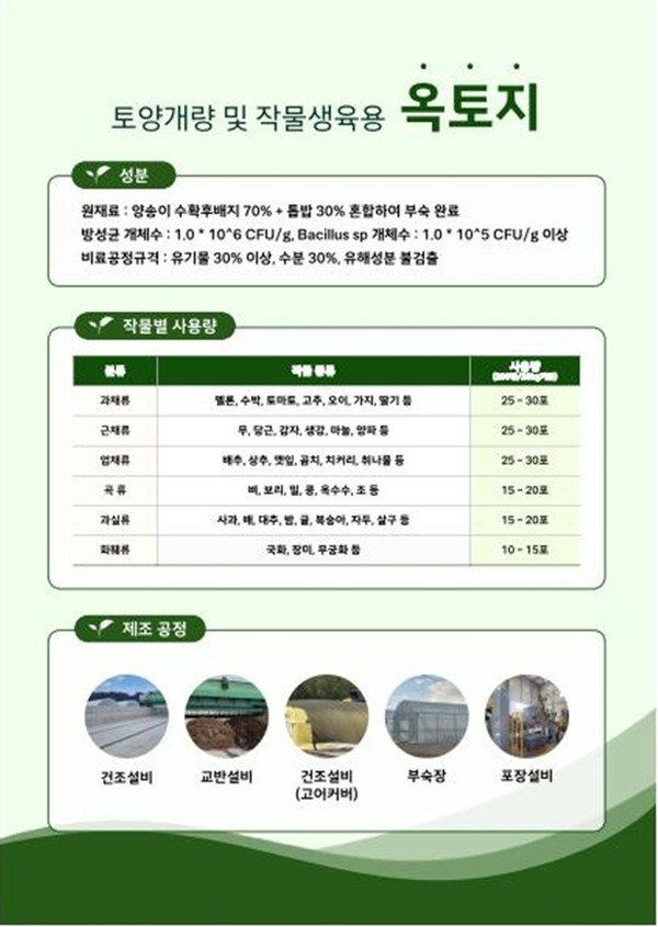 - 양송이 수확후배지 주원료, 톱밥과 산야초 효소 혼합해 만든 토양개량제...고온 자연건조, 유해균 멸균한 제품