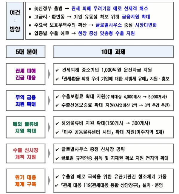- 관세피해 긴급 대응, 무역금융 지원 확대, 물류비 지원 확대, 수출 신시장 개척 지원, 위기대응체계 구축...5개 분야 10대 핵심과제 추진