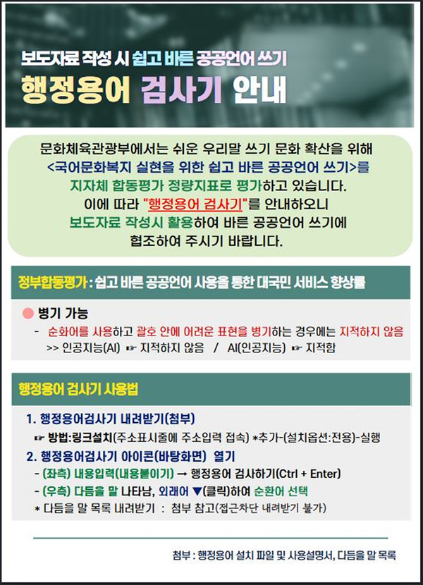 이러한 공공언어 개선 노력은 지방정부 보도자료를 표본으로 추출해 공공언어 사용 실태를 평가하는 지방정부 합동평가 지표 향상에도 기여할 것으로 기대된다.