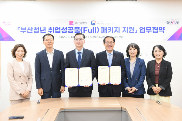 부산시와 부산지방고용노동청이 5월 13일 시청 국제의전실에서 전국 유일의 ‘지역 정착형 청년고용지원 모델’인 「부산청년 취업성공풀(Full) 패키지 지원」 업무협약을 체결했다.